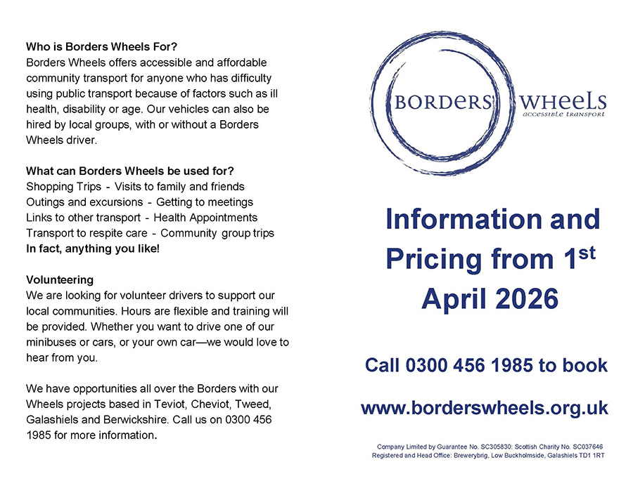 The Borders Wheels Community Transport Service operates a number of wheelchair accessible vehicles, supported by volunteer drivers. Our service is available for individuals living independently or in care who need help with transport, and also for community/voluntary groups.